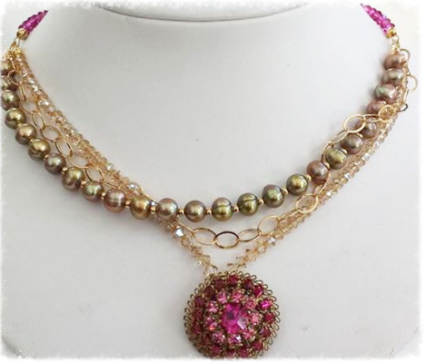 are a stand-out statement piece! Many of the pendants are antique, vintage or re-purposed clip on earrings that can be taken off so that the necklace can be worn plain. Featured elements include Austrian pearl, Austrian crystal, 24k seed delica beads from India, sterling, gold-filled, freshwater pearl and semi-precious stones.