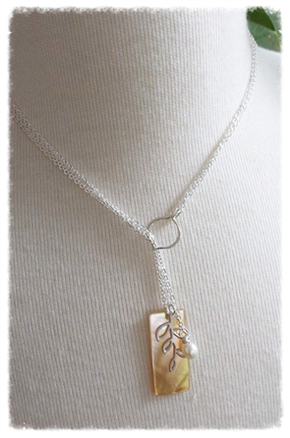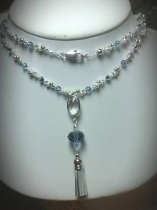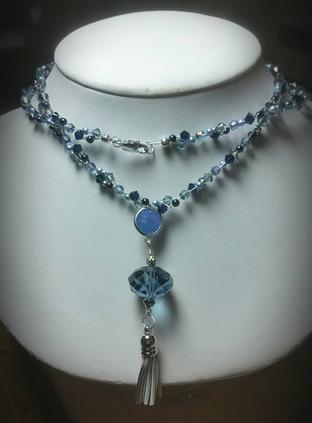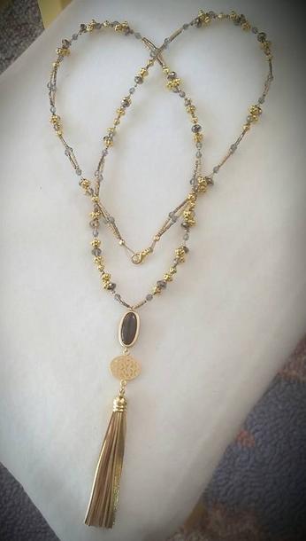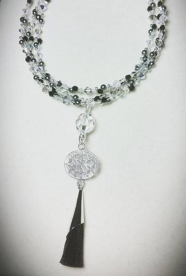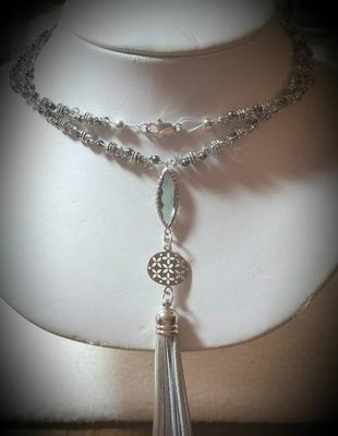 The double woven strand has extended to a long and lovely necklace with leather or corn tassel finish, featuring pearl and crystal details!